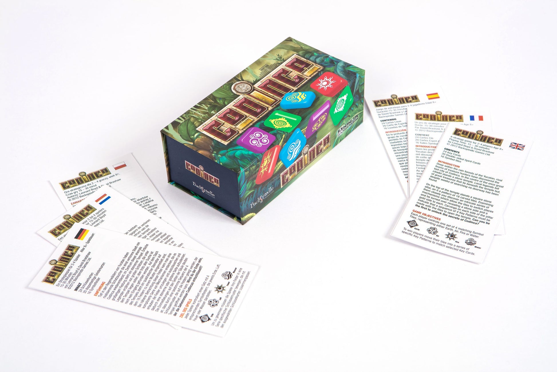 Just like being at a real temple with movable stones, the tiles can be laid out in a matter of seconds on any flat surface. Each play uses either Earth, Wind, Air or water tiles. First of all, players try to complete their own code of four patterns using double-sided tiles to win the game. In addition, they have each got three Spirit Cards which can be especially relevant to win a game.
